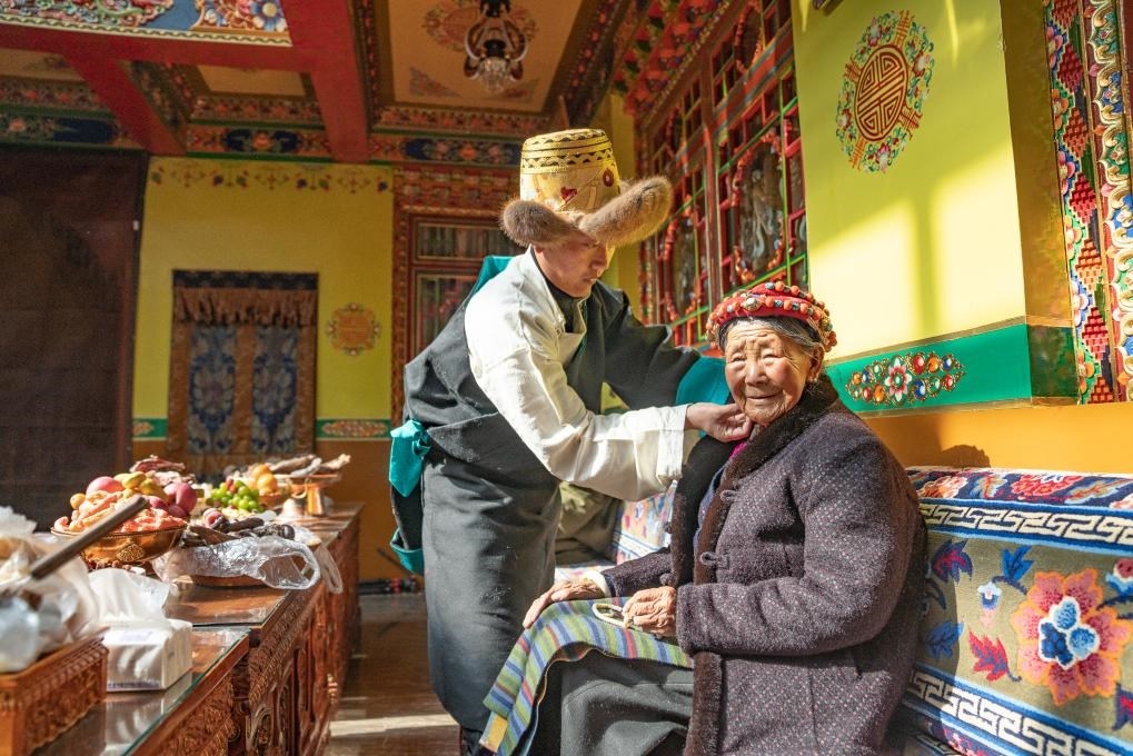 按照傳統(tǒng)習(xí)俗,巴桑普尺一家人盛裝迎新。男性長(zhǎng)輩外著氆氌藏袍,頭頂金絲帽,腳蹬藏靴;女性長(zhǎng)輩身穿真絲綢緞衫,搭配無(wú)袖藏袍,胸前佩戴綠松石、瑪瑙、珊瑚等首飾;小輩們也都穿上了嶄新藏裝。