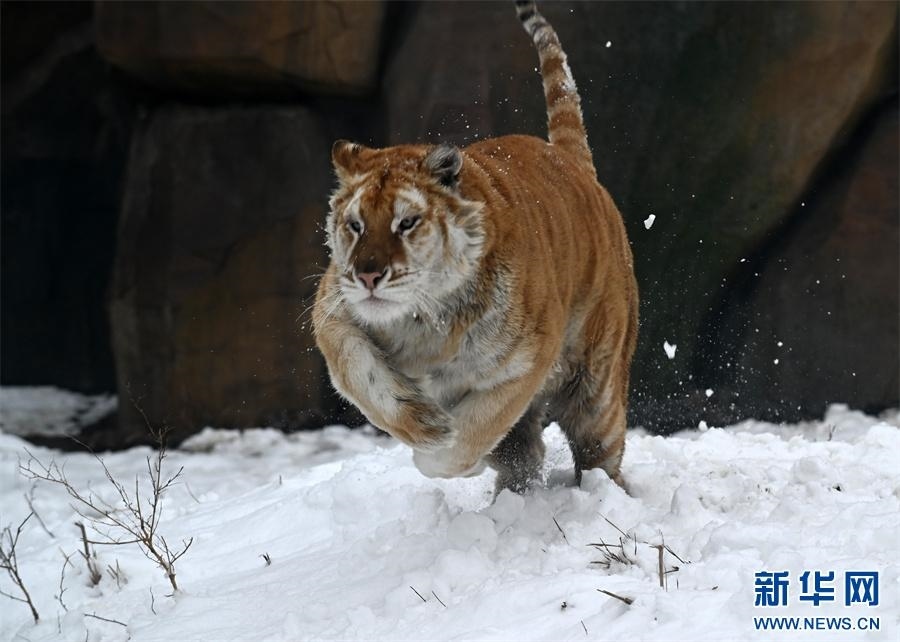 河南省沁陽(yáng)市和生森林動(dòng)物樂(lè)園大型貓科動(dòng)物散養(yǎng)區(qū),一只孟加拉金虎在雪地上奔跑。