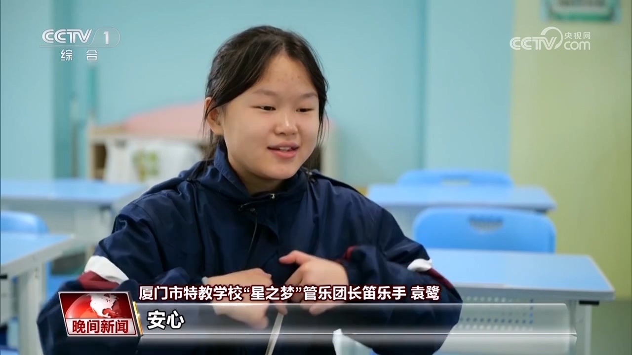 廈門(mén)市特教學(xué)?!靶侵畨?mèng)”管樂(lè)團(tuán)長(zhǎng)笛 袁鷺:我跟不上他們,然后老師肩膀拍我才可以跟得上。