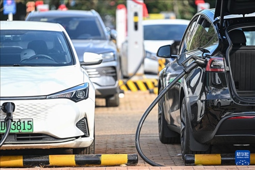 1月20日,新能源電動汽車在位于海南省海口市的椰速充??谖捏w公園全液冷超充站充電。新華社記者 蒲曉旭 攝