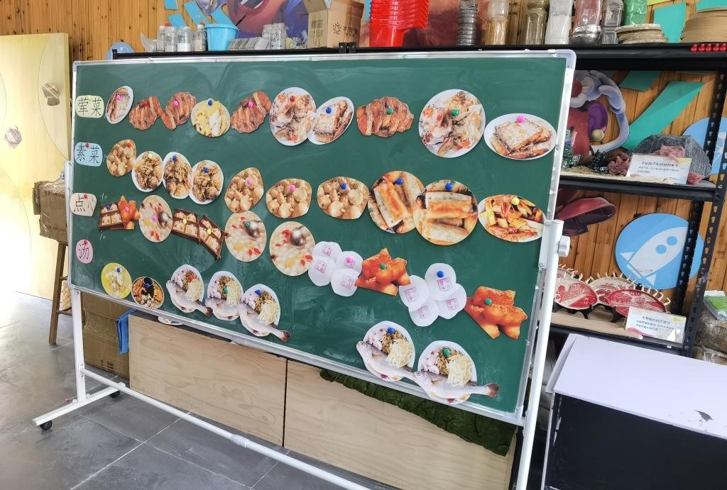 在淮河小學(xué),當(dāng)?shù)啬暌癸埑R?jiàn)菜品的一些圖片貼在小黑板上。新華社記者顧小立 攝