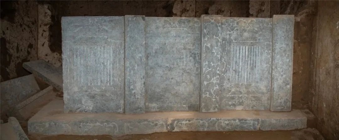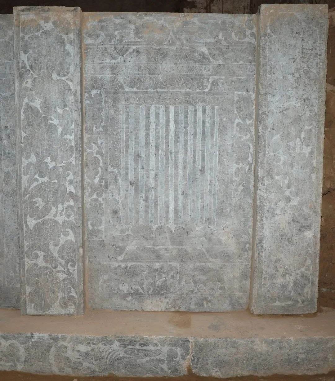 墓室西側(cè)發(fā)現(xiàn)石槨一具,保存較好。石槨面闊三間,進(jìn)深兩間,頂部為廡殿式,僅一側(cè)雕刻有瓦棱;槨身由壁板和倚柱卯和而成,板壁外側(cè)雕刻門窗、卷云及神獸,內(nèi)側(cè)主體為侍女,周邊飾有花草等內(nèi)容;倚柱內(nèi)外均刻纏枝卷草花朵,部分穿插飛禽走獸;基座以七塊石板鋪成,立面間隔刻有壸門圖案,內(nèi)填奔獸圖樣。石槨線刻精細(xì),畫(huà)面華麗而不繁縟,人物體態(tài)豐腴而不臃腫,充分體現(xiàn)出盛唐開(kāi)元時(shí)期圖案靈動(dòng)、富于想象的特征。