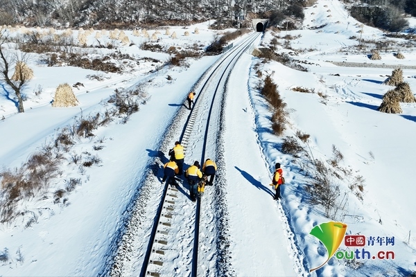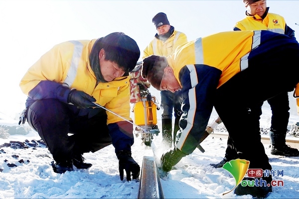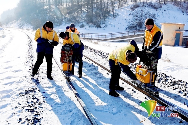 兩臺超聲波鋼軌探傷儀,在身穿橙黃色工作服的探傷工的推行下,緩緩向線路遠方走去。寒風中,探傷工們從頭到腳的防寒裝備也為他們在冬季室外作業(yè)提供了保障。