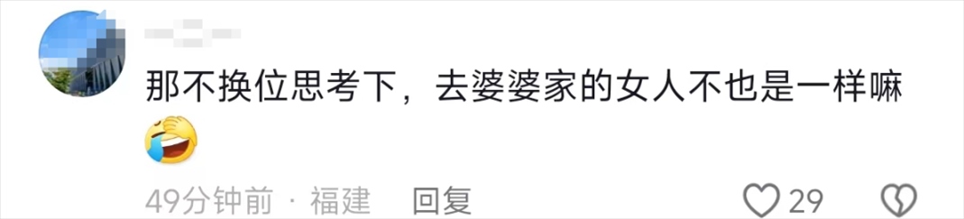 還有網(wǎng)友表示,這個(gè)時(shí)候,女婿更應(yīng)該能過體諒媳婦在婆家過年的難處了,大家過年要互相體諒,換位思考。