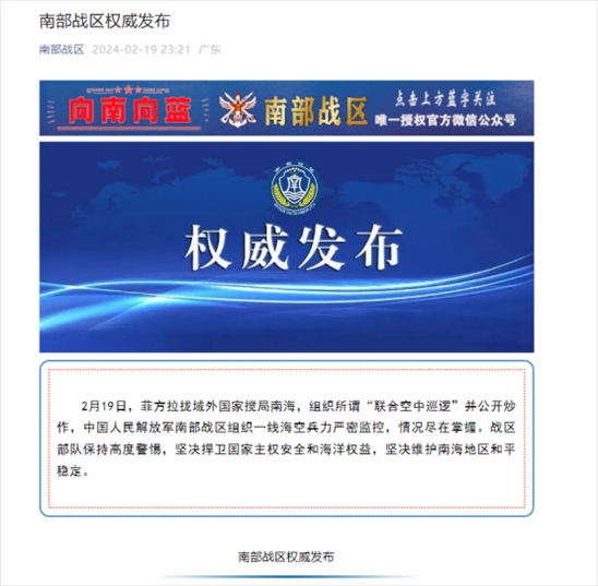 ·南部戰(zhàn)區(qū)回應菲方組織所謂“聯(lián)合空中巡邏”:情況盡在掌握,戰(zhàn)區(qū)部隊保持高度警惕。