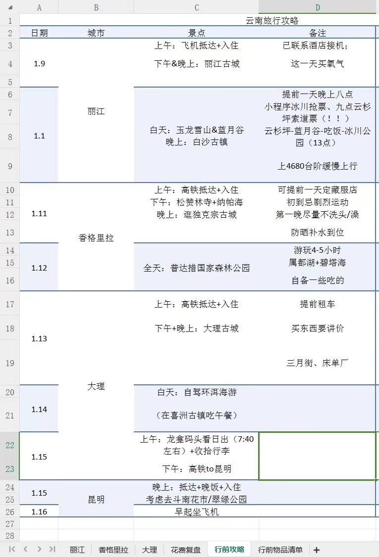 這個冬天去云南旅行前,周玫將自己的計劃制成一張excel表格,具體到每個市、每個景點、每種美食……旅行結(jié)束后,她還對云南游的具體執(zhí)行情況進行了復盤總結(jié),在社交平臺上分享給她的“電子驢友”。
