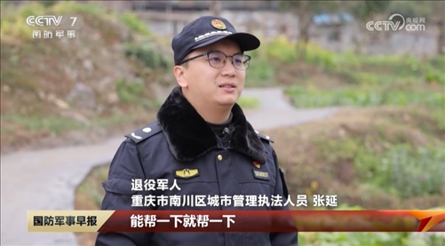 重慶市南川區(qū)城市管理執(zhí)法人員張延是一名退役軍人,看到老人年紀(jì)這么大了,孫子又在作戰(zhàn)一線,他常常幫助老人做一些力所能及的事情。
