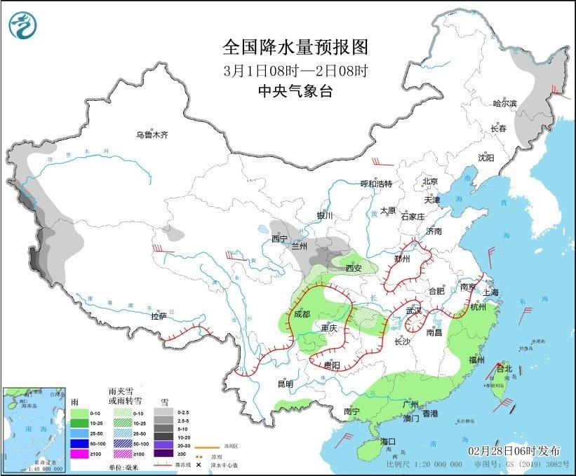 2月28日08時至29日08時,內(nèi)蒙古東北部、東北地區(qū)、西藏東部、西北地區(qū)中東部、川西高原北部、山西南部等地部分地區(qū)有小到中雪或雨夾雪,其中,甘肅河西和東部等地部分地區(qū)有大雪(5~9毫米)。江淮大部、江漢大部、江南、西南地區(qū)東部、華南大部等地部分地區(qū)有小到中雨,其中,湖南中南部、江西中部、廣西東北部等地部分地區(qū)有大雨(25~35毫米)。西藏北部、青海西部等地部分地區(qū)有5~6級風(fēng)。