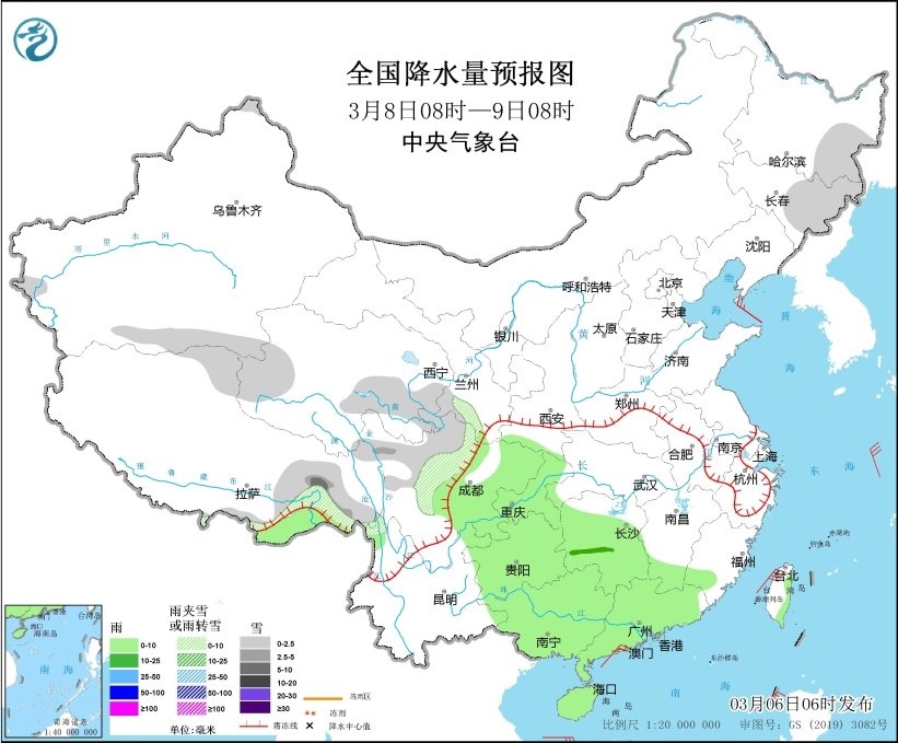 3月8日08時至9日08時,東北地區(qū)東部、西藏東部、青海東部、甘肅南部、川西高原北部等地部分地區(qū)有小雪或雨夾雪,其中,西藏東部等地部分地區(qū)有中到大雪。江南南部和西部、西南地區(qū)東部、華南等地部分地區(qū)有小雨,其中,湖南中西部等地部分地區(qū)有中雨(見圖3)。