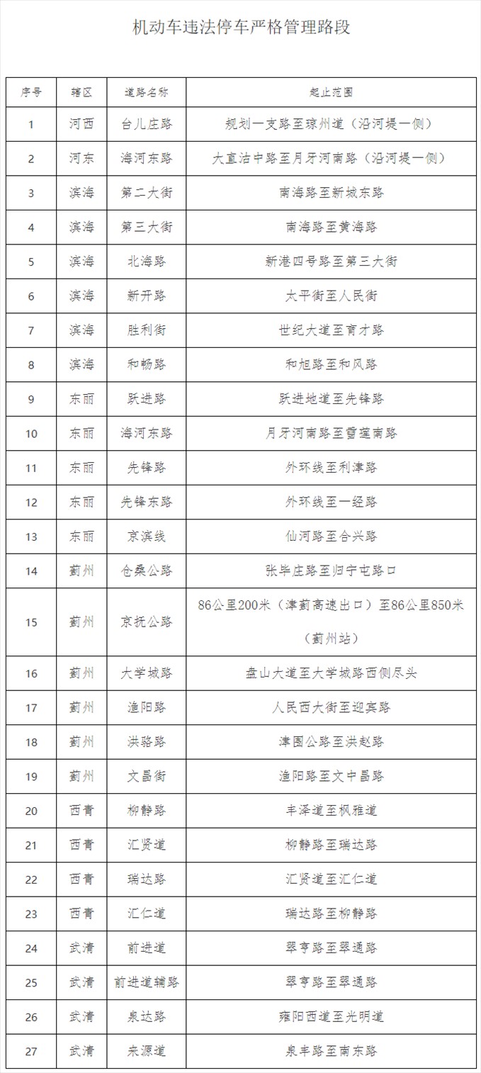 為進(jìn)一步加強(qiáng)天津市道路交通安全管理,規(guī)范靜態(tài)交通秩序,提高道路通行能力,根據(jù)《中華人民共和國(guó)道路交通安全法》及其實(shí)施條例等有關(guān)法律法規(guī)規(guī)定,天津市公安交通管理局根據(jù)道路通行實(shí)際情況,決定自2024年3月18日起,將下列27條路段設(shè)置為機(jī)動(dòng)車違法停車嚴(yán)格管理路段。機(jī)動(dòng)車在嚴(yán)格管理路段內(nèi)違法停放的,公安交管部門將在提醒糾正的同時(shí)依法予以處罰。