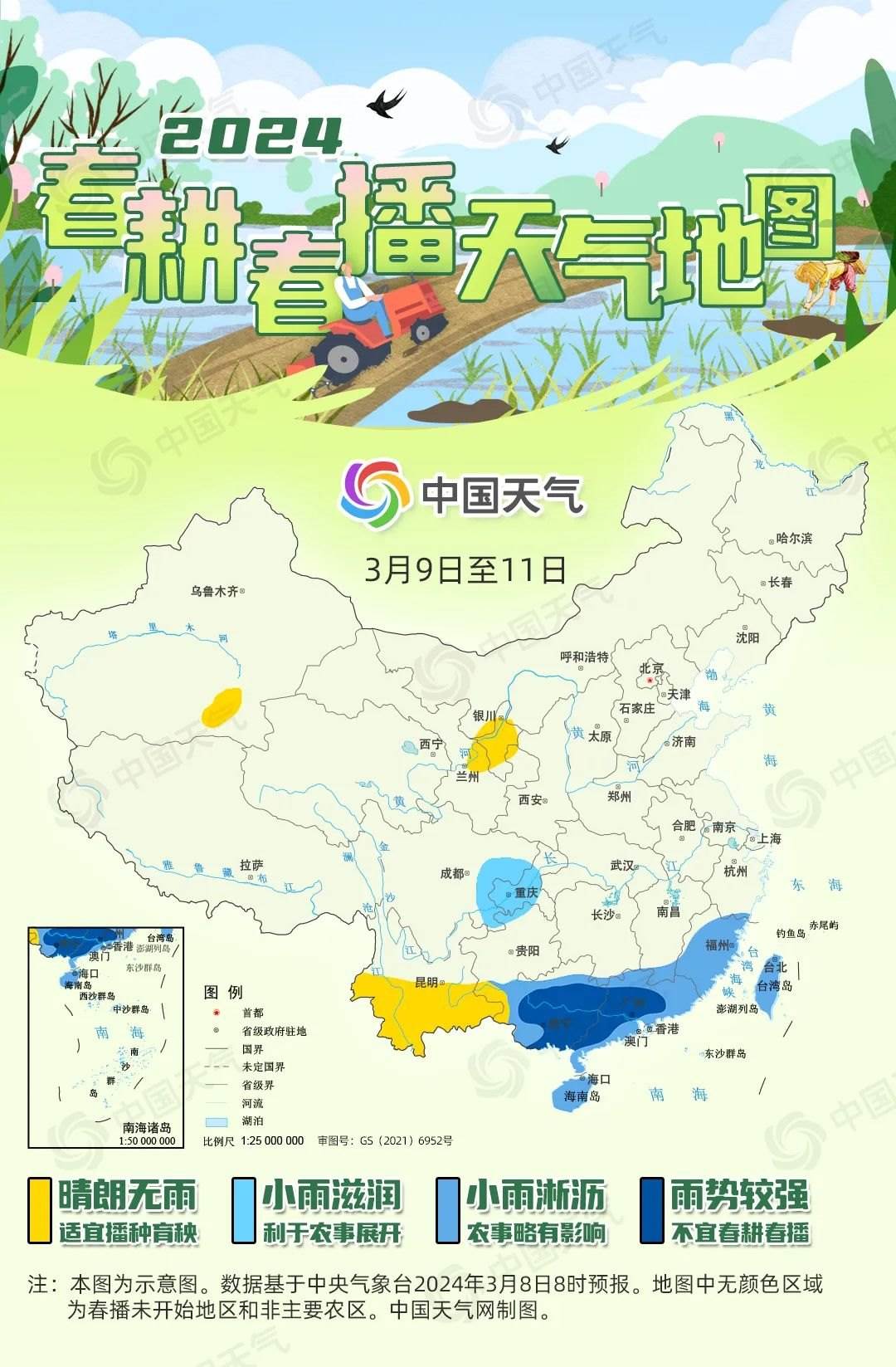 “微雨眾卉新,一雷驚蟄始。田家?guī)兹臻e,耕種從此起。”到了驚蟄時節(jié),我國春耕春播工作已陸續(xù)展開,從華南到西北,田間地頭逐漸忙碌了起來。一年之計(jì)在于春,春耕春播工作對于全年糧食豐收至關(guān)重要。中國天氣網(wǎng)推出2024全國春播進(jìn)程圖和春耕春播天氣地圖,看各地春播何時展開,近期春播天氣如何。