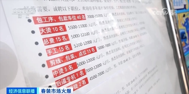 服裝批發(fā)生意的火熱,也帶來(lái)了用工需求的增加,不少檔口都貼上了招工的廣告。廣東深圳南油服裝批發(fā)市場(chǎng)批發(fā)商戶 邱林:現(xiàn)在的翻單需求量比較大,大家都在搶工人,現(xiàn)在排單排到快半個(gè)月、十幾天,我們店鋪還在招店員。