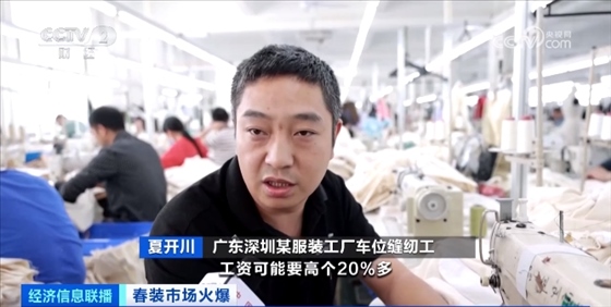 深圳另一家服裝工廠里,一批批春裝整齊地堆放在車間,正等著最后的包裝發(fā)貨。這兩天,這些春裝將發(fā)往全國(guó)各地。朱以做服裝批發(fā)已經(jīng)有九個(gè)年頭,他表示,目前的訂單同比增長(zhǎng)超3倍,工廠訂單排期已經(jīng)到了兩個(gè)月后,最近工廠也在不斷招人提升產(chǎn)能。