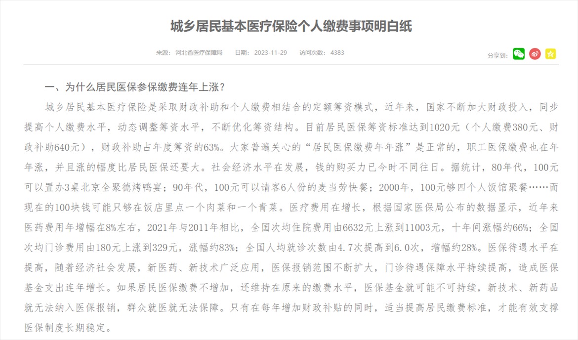 記者注意到,河北省醫(yī)保局去年11月份曾發(fā)布《城鄉(xiāng)居民基本醫(yī)療保險個人繳費事項明白紙》,其中就“為什么居民醫(yī)保參保繳費連年上漲?”問題回應(yīng)稱:“大家普遍關(guān)心的‘居民醫(yī)保繳費年年漲’是正常的,職工醫(yī)保繳費也在年年漲,并且漲的幅度比居民醫(yī)保還要大。社會經(jīng)濟水平在發(fā)展,錢的購買力已今時不同往日,醫(yī)療費用在增長,醫(yī)保待遇水平在提高。如果居民醫(yī)保繳費不增加,還維持在原來的繳費水平,醫(yī)?;鹁涂赡懿豢沙掷m(xù),新技術(shù)、新藥品就無法納入醫(yī)保報銷,群眾就醫(yī)就無法保障。”