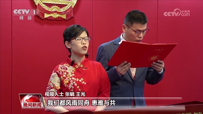 視障人士 張毓 王光:相濡以沫,鐘愛一生,今后無論順境還是逆境,無論富有還是貧窮,無論健康還是疾病,無論青春還是年老,我們都風(fēng)雨同舟,患難與共,成為終生的伴侶。