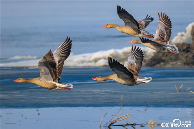 新疆巴州,隨著天氣轉(zhuǎn)暖,冰雪消融的博斯騰湖迎來(lái)大批候鳥(niǎo)。