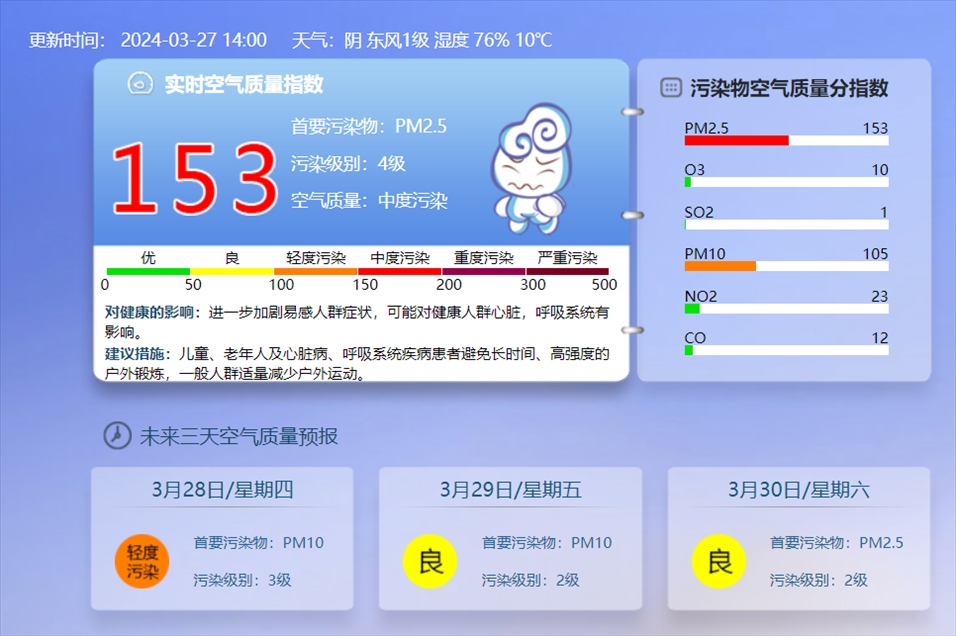 建議措施:兒童、老年人及心臟病、呼吸系統(tǒng)疾病患者避免長時間、高強度的戶外鍛煉,一般人群適量減少戶外運動。