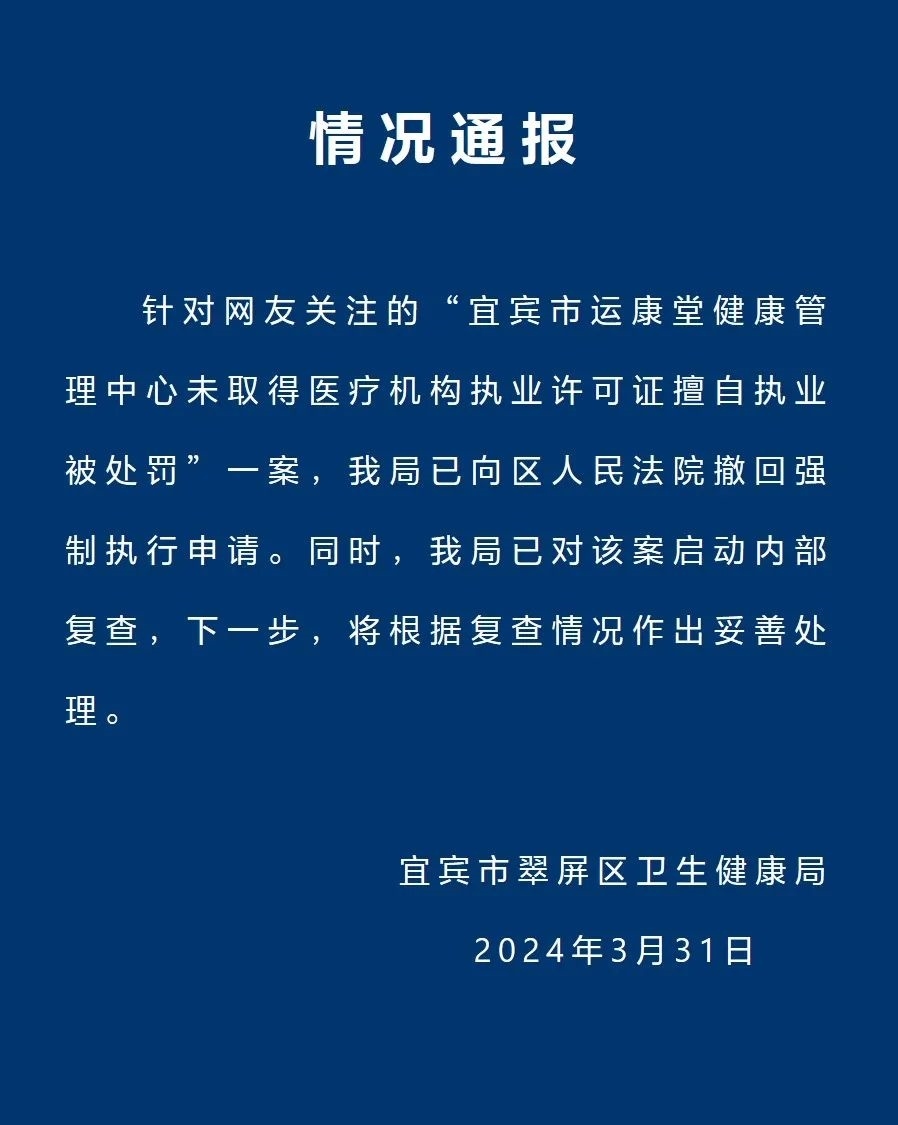 央視網(wǎng)消息:據(jù)宜賓市翠屏區(qū)衛(wèi)生健康局發(fā)布情況通報,3月31日,針對網(wǎng)友關注的“宜賓市運康堂健康管理中心未取得醫(yī)療機構(gòu)執(zhí)業(yè)許可證擅自執(zhí)業(yè)被處罰”一案,宜賓市翠屏區(qū)衛(wèi)生健康局已向區(qū)人民法院撤回強制執(zhí)行申請。同時,宜賓市翠屏區(qū)衛(wèi)生健康局已對該案啟動內(nèi)部復查,下一步,將根據(jù)復查情況作出妥善處理。