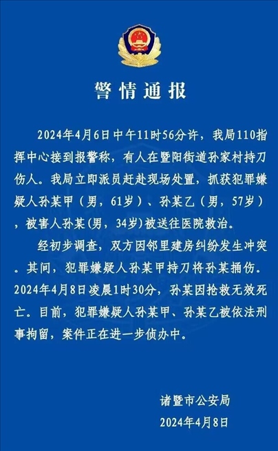 ·浙江諸暨警方通報(bào)律師被捅傷致死:兩名犯罪嫌疑人已被依法刑事拘留。