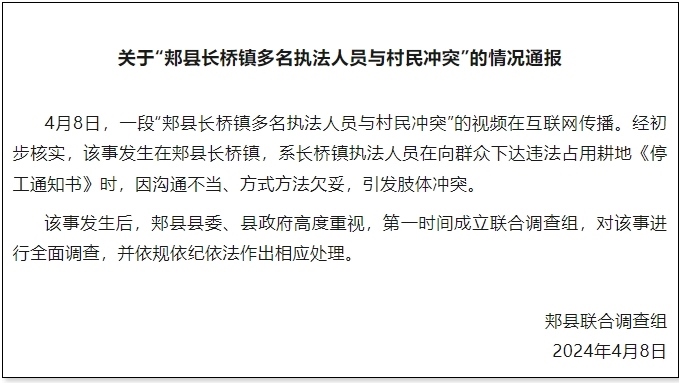 央視網(wǎng)消息:據(jù)“郟縣發(fā)布”公眾號消息,河南省平頂山市郟縣聯(lián)合調(diào)查組發(fā)布情況通報(bào),4月8日,一段“郟縣長橋鎮(zhèn)多名執(zhí)法人員與村民沖突”的視頻在互聯(lián)網(wǎng)傳播。經(jīng)初步核實(shí),該事發(fā)生在郟縣長橋鎮(zhèn),系長橋鎮(zhèn)執(zhí)法人員在向群眾下達(dá)違法占用耕地《停工通知書》時(shí),因溝通不當(dāng)、方式方法欠妥,引發(fā)肢體沖突。