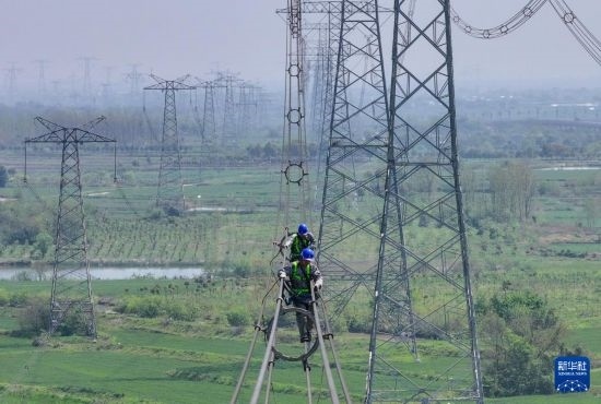 4月9日,在位于安徽省合肥市廬江縣郭河鎮(zhèn)的直流±800千伏建蘇線3418號桿塔處,國網(wǎng)合肥供電公司工人進(jìn)行高空檢修作業(yè)(無人機(jī)照片)。