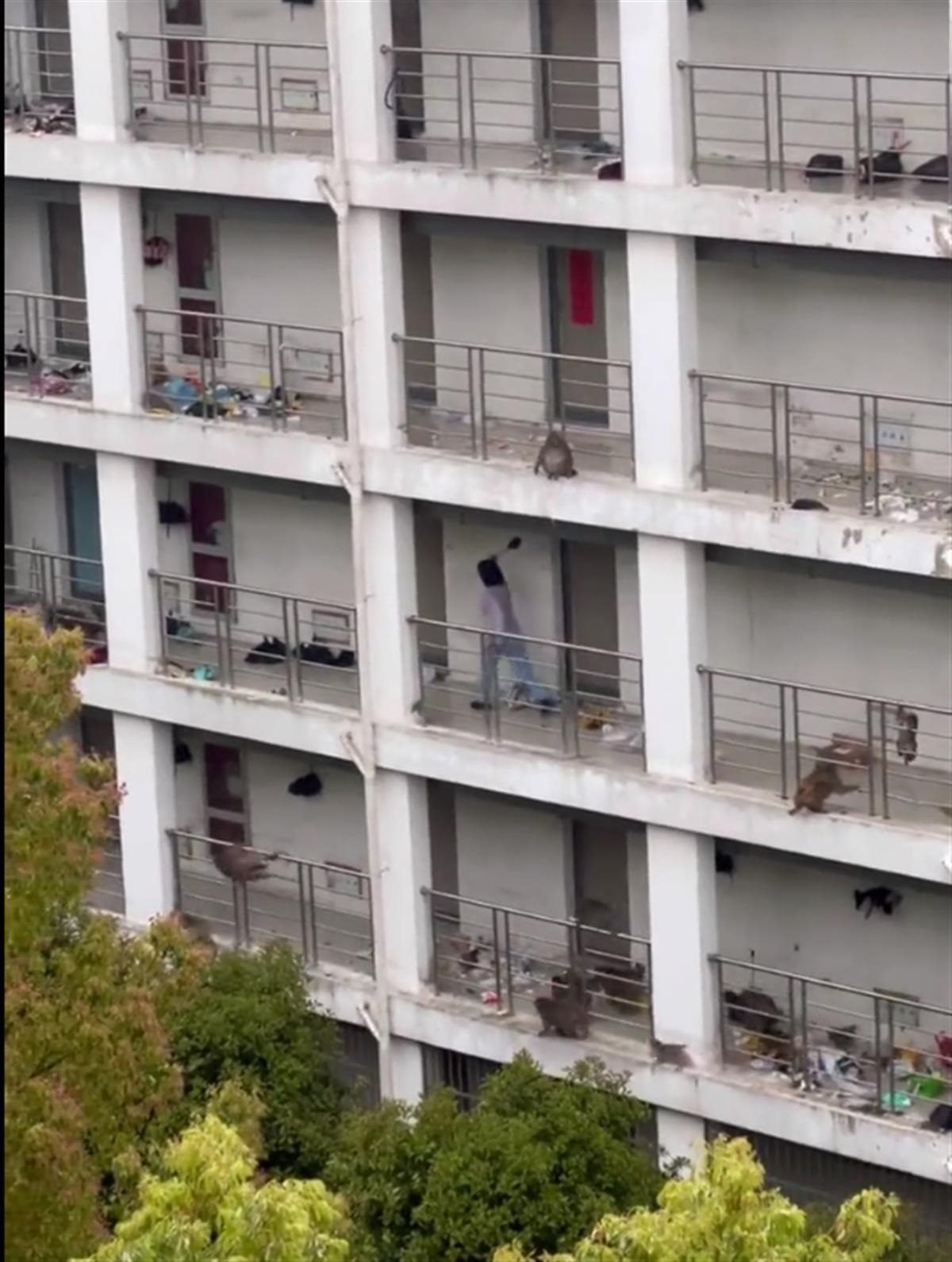 網(wǎng)絡(luò)視頻顯示,多只猴子在一棟大學(xué)生宿舍的走廊上奔跑,一名女生拿著一把傘一路驅(qū)趕;大樓多層走廊上的垃圾袋也被猴群弄破,地面上一片狼藉。