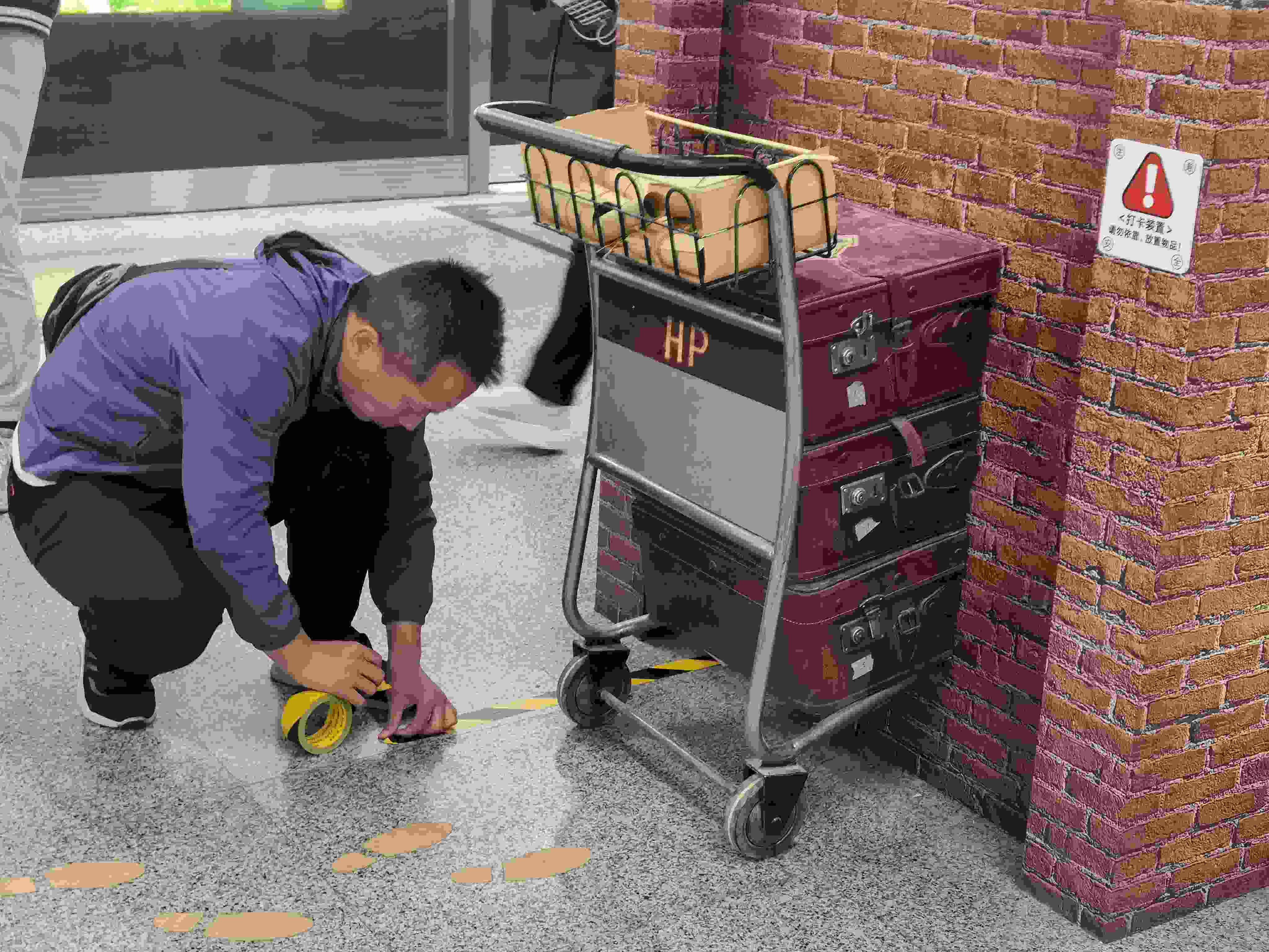 工作人員為裝飾墻周?chē)N上警戒線