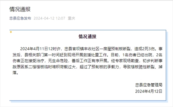 央視網(wǎng)消息:據(jù)“忠縣應(yīng)急發(fā)布”公眾號消息,重慶忠縣應(yīng)急管理局通報,2024年4月11日12時許,忠縣官壩鎮(zhèn)豐收社區(qū)一房屋預(yù)制板斷裂,造成2死3傷。事發(fā)后,縣相關(guān)部門第一時間趕到現(xiàn)場開展救援處置工作。目前,1名傷者已經(jīng)出院,2名傷者正在接受治療,無生命危險,善后工作正有序開展。經(jīng)專家現(xiàn)場勘查,初步判斷事故原因系二樓樓板臨時堆積荷載過大,超過了預(yù)制板的承載力,導(dǎo)致樓板脆性斷裂、掉落。
