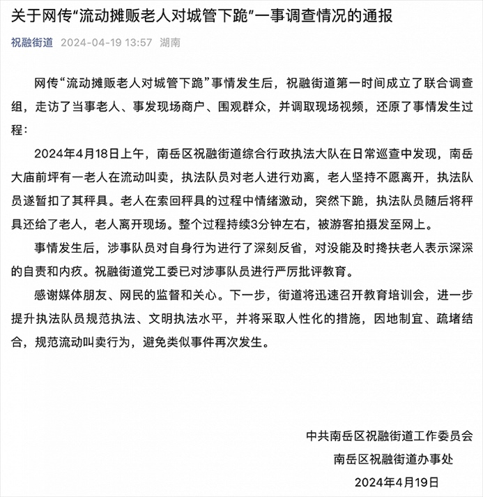 央視網(wǎng)消息:4月19日,衡陽(yáng)南岳區(qū)祝融街道辦事處發(fā)布關(guān)于網(wǎng)傳“流動(dòng)攤販老人對(duì)城管下跪”一事調(diào)查情況的通報(bào)。