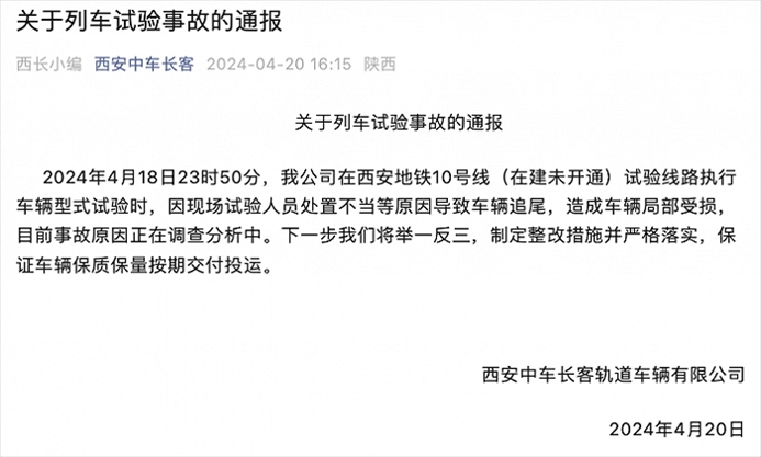 央視網(wǎng)消息:據(jù)西安中車長客官微消息,西安中車長客軌道車輛有限公司4月20日通報,4月18日23時50分,公司在西安地鐵10號線(在建未開通)試驗線路執(zhí)行車輛型式試驗時,因現(xiàn)場試驗人員處置不當?shù)仍驅е萝囕v追尾,造成車輛局部受損,目前事故原因正在調查分析中。下一步將舉一反三,制定整改措施并嚴格落實,保證車輛保質保量按期交付投運。