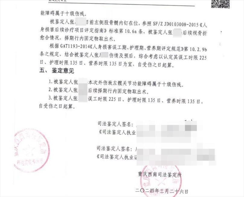 張同學(xué)介紹,第一次開(kāi)庭主要是確定鑒定機(jī)構(gòu)。張同學(xué)提供的司法鑒定書(shū)顯示,2024年3月26日,重慶西南司法鑒定所鑒定認(rèn)為,她本次外傷致左髖關(guān)節(jié)功能十級(jí)傷殘。其左側(cè)股骨髓內(nèi)釘在位,后續(xù)視骨折愈合情況,擇期行內(nèi)固定物取出術(shù)。