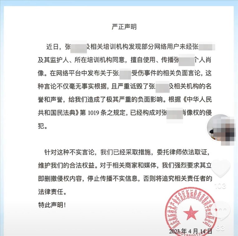 紅星新聞注意到,遠(yuǎn)倫舞蹈帳號(hào)2023年2023年4月曾發(fā)布一則聲明。落款為重慶高新技術(shù)產(chǎn)業(yè)開(kāi)發(fā)區(qū)新遠(yuǎn)倫教育培訓(xùn)學(xué)校有限公司(下稱遠(yuǎn)倫培訓(xùn)學(xué)校)。聲明稱,近日,張某涵及相關(guān)培訓(xùn)機(jī)構(gòu)發(fā)現(xiàn)部分網(wǎng)絡(luò)用戶未經(jīng)張某涵及其監(jiān)護(hù)人、所在培訓(xùn)機(jī)構(gòu)同意,擅自使用、傳播張某涵個(gè)人肖像。在網(wǎng)絡(luò)平臺(tái)中發(fā)布關(guān)于受傷事件的相關(guān)負(fù)面言論,這種言論不僅毫無(wú)事實(shí)根據(jù),且嚴(yán)重詆毀了張某涵及相關(guān)機(jī)構(gòu)的名譽(yù)和聲譽(yù),給公司造成了極其嚴(yán)重的負(fù)面影響,已經(jīng)構(gòu)成對(duì)張某涵肖像權(quán)的侵犯。