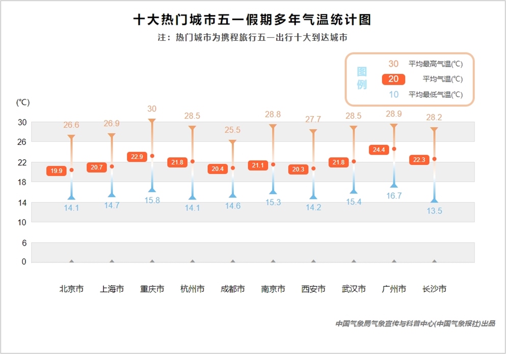 熱門城市中,北京5月1日至4日以晴為主,最高氣溫在26℃至28℃,適宜出行游玩,5日預(yù)計(jì)將出現(xiàn)小雨,氣溫略有下降。西安則在4日會出現(xiàn)小雨,其他時間以多云和陰天為主,氣溫在23℃上下,非常適宜出行。位于中東部地區(qū)的上海、杭州、南京等熱門城市5月1日-3日均以多云和陰天為主,最高氣溫均在20℃左右,溫度適宜,4至5日將出現(xiàn)小雨,出行還需注意做好防雨準(zhǔn)備。長沙和武漢3日至4日將出現(xiàn)中雨至大雨天氣,不適宜戶外游玩。位于西南地區(qū)的成都和重慶“五一”假期前四天都將被小雨籠罩,直到5日才會放晴。