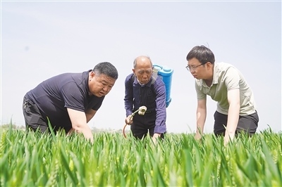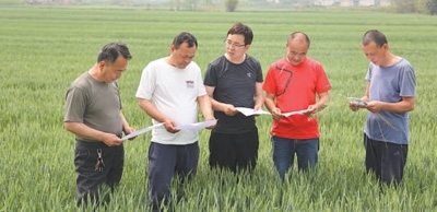 蘇丹(中)在指導(dǎo)村民進行小麥揚花期田間管理。本報記者 原韜雄攝
