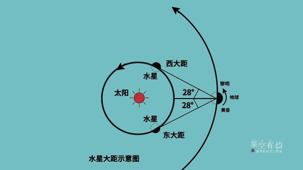 中國天文學(xué)會會員、天津市天文學(xué)會理事楊婧表示,想一睹水星“真容”,要等到它與太陽的角距離達(dá)到最大時(shí),也就是從地球上看水星距離太陽最遠(yuǎn)的位置。如果水星出現(xiàn)在太陽東邊,稱為東大距,此時(shí)水星在黃昏時(shí)的西邊低空出現(xiàn);如果水星出現(xiàn)在太陽西邊,稱為西大距,此時(shí)水星在黎明時(shí)的東方低空出現(xiàn)。每年通常會有6至7次水星大距,其中包括東大距和西大距。