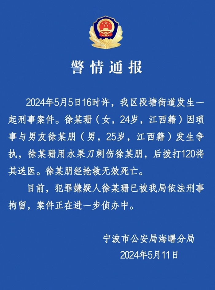 央視網(wǎng)消息:5月11日,寧波市公安局海曙分局發(fā)布警情通報(bào),5月5日16時(shí)許,海曙區(qū)段塘街道發(fā)生一起刑事案件。徐某珊(女,24歲,江西籍)因瑣事與男友徐某朋(男,25歲,江西籍)發(fā)生爭執(zhí),徐某珊用水果刀刺傷徐某朋,后撥打120將其送醫(yī)。徐某朋經(jīng)搶救無效死亡。目前,犯罪嫌疑人徐某珊已被海曙分局依法刑事拘留,案件正在進(jìn)一步偵辦中。