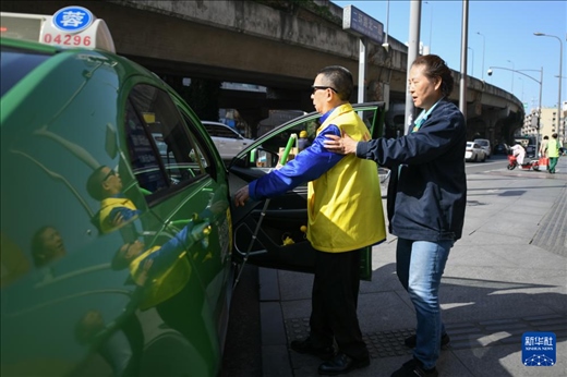 5月13日,張世維在成都雷鋒車隊志愿者幫助下乘車前往周年慶活動現(xiàn)場。新華社記者 胥冰潔 攝