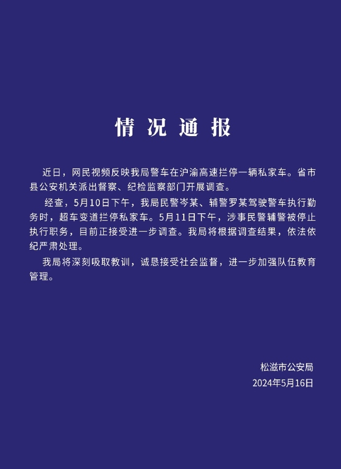 ·警車(chē)高速公路逼停小車(chē),湖北松滋警方通報(bào):涉事民輔警被停職。