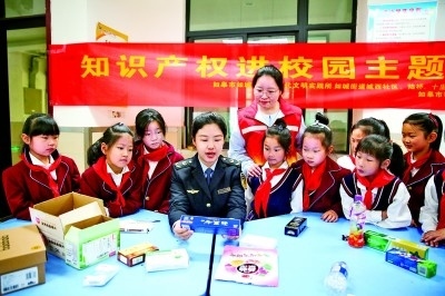 江蘇如皋市版權(quán)局聯(lián)合市場(chǎng)監(jiān)督等部門(mén),圍繞商標(biāo)權(quán)、專利權(quán)等開(kāi)展“知識(shí)產(chǎn)權(quán)進(jìn)校園”宣傳教育活動(dòng)。新華社發(fā)
