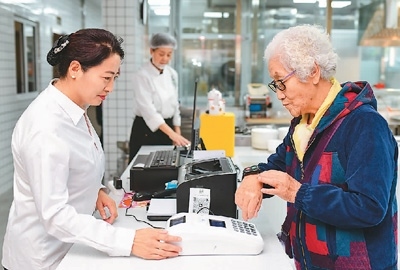 一位老人在內(nèi)蒙古自治區(qū)鄂爾多斯市康巴什區(qū)神華康城社區(qū)“鄰里食堂”使用智能積分刷卡器用餐。王 正攝(人民視覺)
