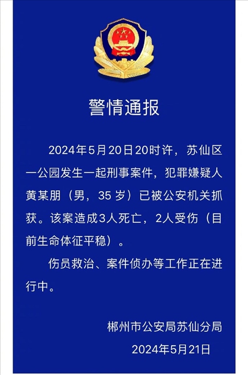 ·湖南郴州一公園發(fā)生刑事案件,致3人死亡2人受傷。