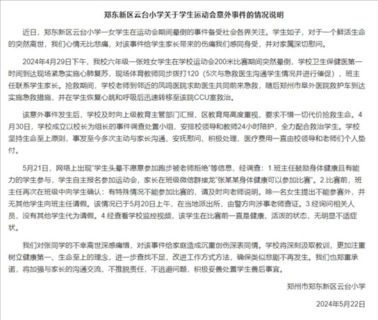 ·鄭州一小學(xué)生短跑暈倒后離世,學(xué)校通報(bào)系自主報(bào)名賽前無不適。