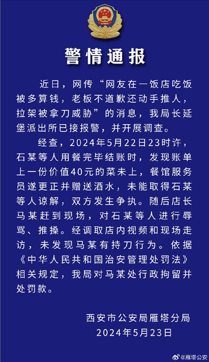 ·網(wǎng)友稱在飯店吃飯被多算錢還遭威脅,西安雁塔警方通報(bào)。