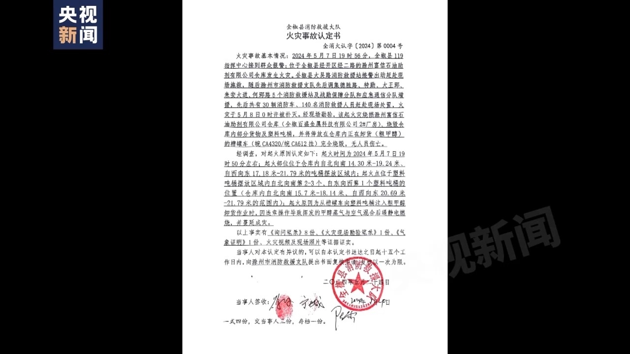 記者從全椒縣消防救援大隊于5月24日出具的火災(zāi)事故認(rèn)定書上發(fā)現(xiàn),5月7日晚上7點多,滁州富信助劑有限公司倉庫發(fā)生火災(zāi),滁州市消防救援支隊調(diào)集30輛消防車、140名消防救援人員現(xiàn)場處置,火災(zāi)于5月8日0時許撲滅。經(jīng)現(xiàn)場勘驗,該起火災(zāi)燒損滁州富信石油助劑有限公司倉庫、燒毀倉庫內(nèi)部分貨物及塑料噸桶,并將停放在倉庫內(nèi)正在卸粗甲醇的槽罐車完全燒毀,無人員傷亡。