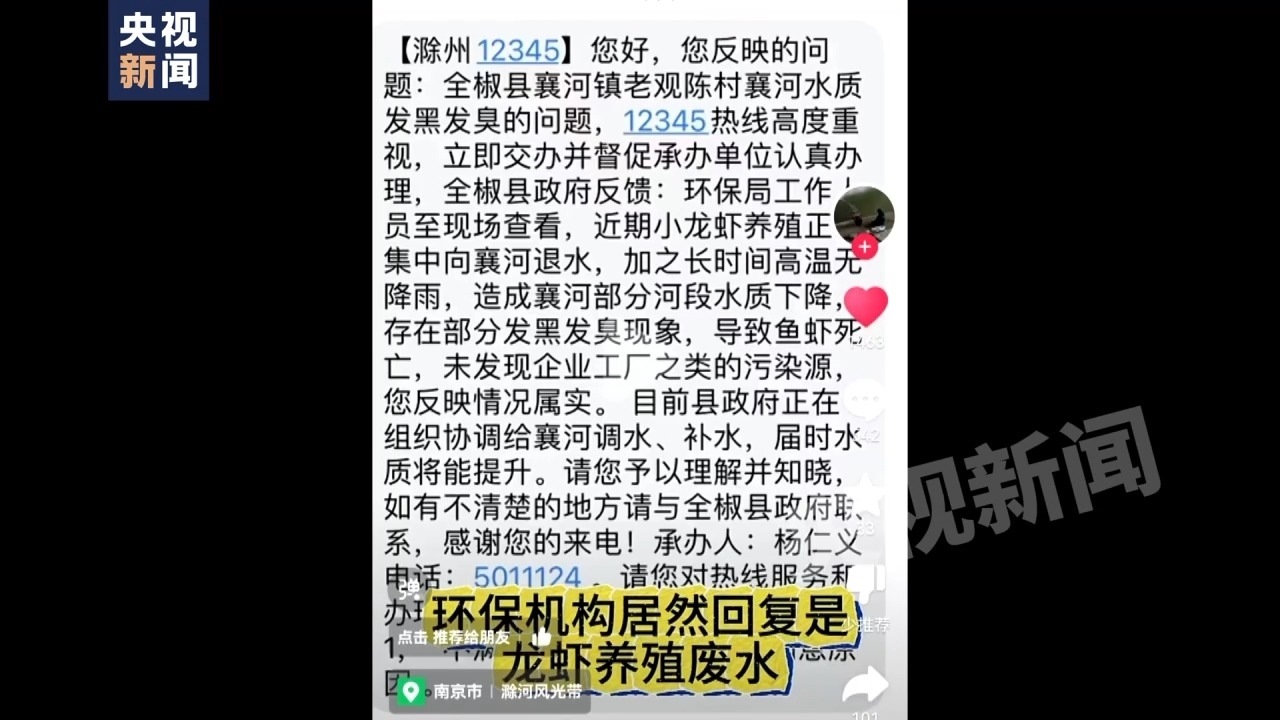 記者:但是我看到了有一個滁州12345,關(guān)于全椒縣襄河鎮(zhèn)老觀陳村襄河水質(zhì)發(fā)黑發(fā)臭問題的回復(fù),留的承辦人叫楊仁義。