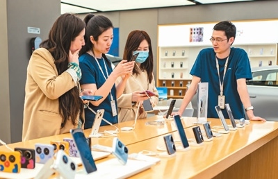 圖為上海華為一家線下門(mén)店內(nèi),消費(fèi)者在體驗(yàn)華為Pura70系列手機(jī)。王 初攝(人民視覺(jué))