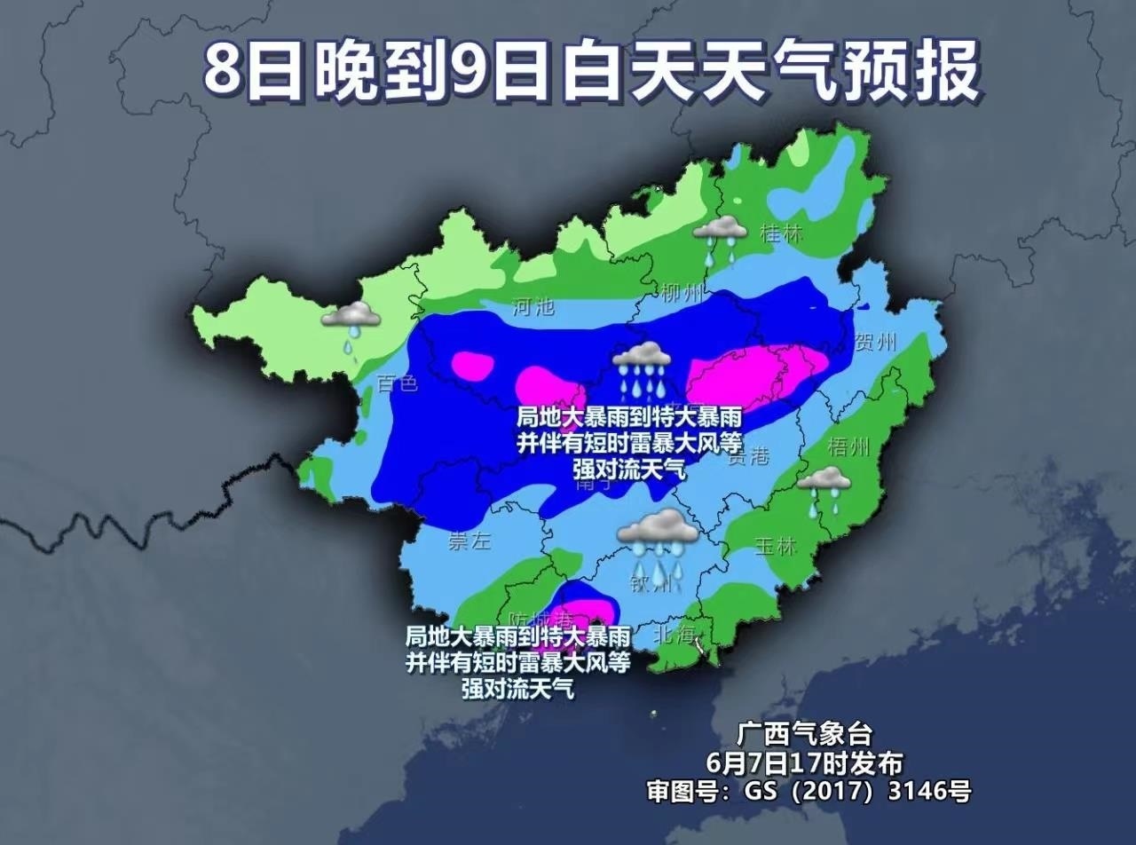 8日晚上到9日白天,雨勢(shì)升級(jí),并進(jìn)入此輪降雨的最強(qiáng)階段,強(qiáng)降雨的范圍也將進(jìn)一步擴(kuò)大,廣西全區(qū)有大雨到暴雨,局地有大暴雨到特大暴雨,并伴有短時(shí)雷暴大風(fēng)等強(qiáng)對(duì)流天氣。