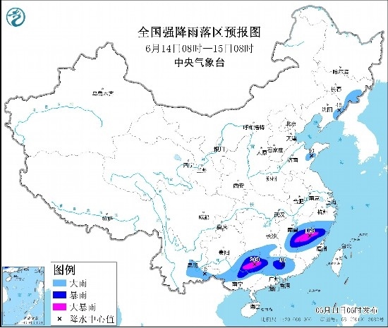 預(yù)計(jì),6月14日08時(shí)至15日08時(shí),江西中東部、浙江南部、福建西部和北部、湖南南部、云南東南部、廣西中北部、廣東中北部以及吉林東部、遼寧東北部、山東南部等地部分地區(qū)有大到暴雨,其中,江西東部、福建西北部、廣西東北部等地部分地區(qū)有大暴雨(100~200毫米)。上述部分地區(qū)伴有短時(shí)強(qiáng)降水(最大小時(shí)降雨量30~50毫米,局地可超過80毫米),局地有雷暴大風(fēng)或冰雹等強(qiáng)對流天氣。中央氣象臺6月14日06時(shí)發(fā)布暴雨黃色預(yù)警(見圖1)。