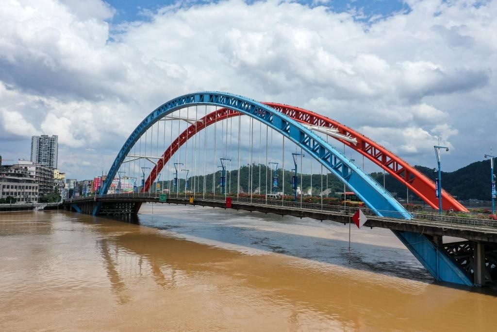 6月21日,位于潯江、桂江、西江“三江”交匯處的鴛江大橋。新華社記者曹祎銘 攝