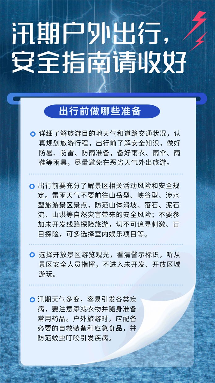 汛期戶外出行,這份安全指南請(qǐng)收好 當(dāng)前正值暑假旅游旺季,也是汛期災(zāi)害事故易發(fā)多發(fā)時(shí)期......